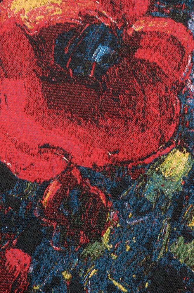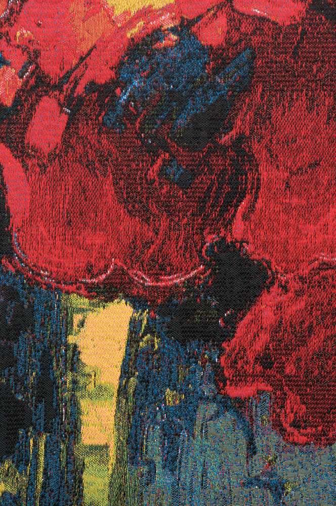 This is an original tapestry reproduction from a painting by Bob Pejman. It is jacquard woven in Belgium. This vivacious take on the Poppy Bouquet still life is reminiscent of an impressionist painting with rough, heavy brush strokes and brilliant colors. Quote: I have blended Classical and Modern elements in this painting. The background is very neutral, reminiscent of backgrounds used in classical floral still life paintings. As a sharp contrast, I have used a palette of Primary Colors: Red, Blue, and Yellow that is inspired by fauvist artists such as Matisse to create a very bold and vibrant bouquet of flowers. This is a work that is transitional in nature and fits in a traditional as well as a contemporary setting.