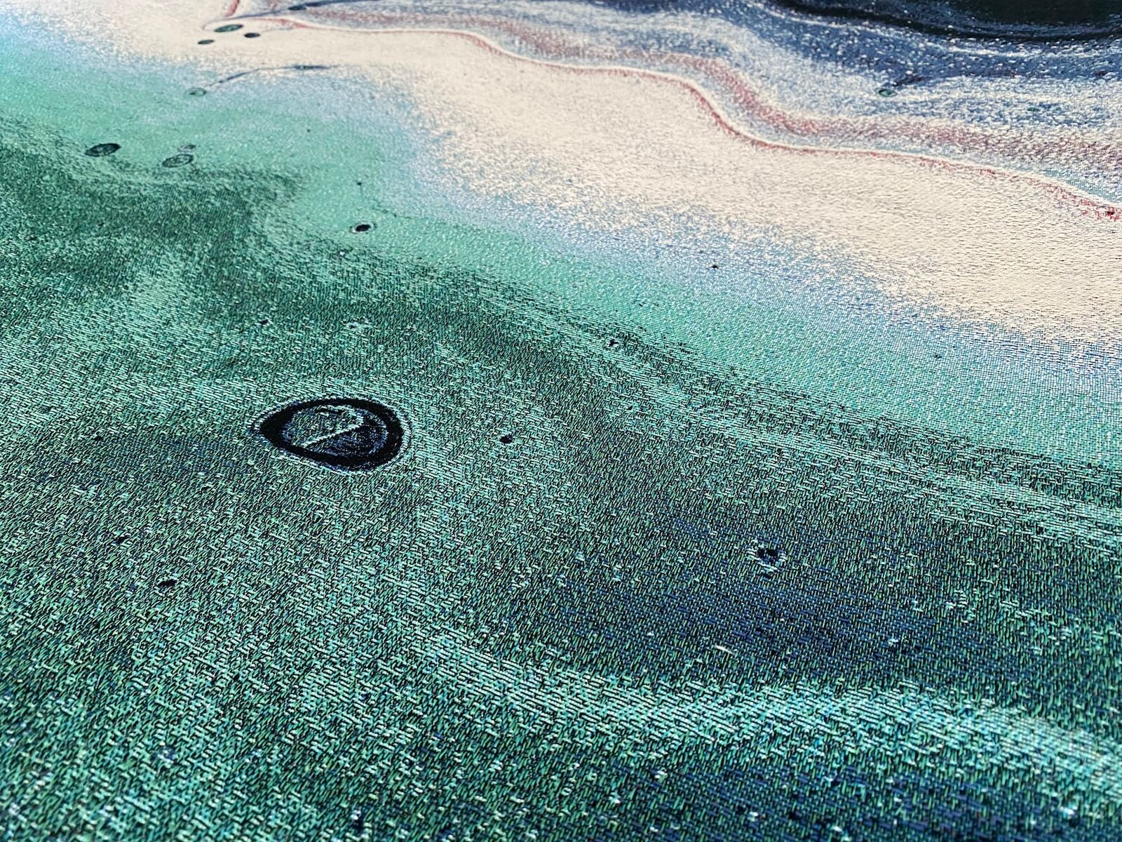 A simple and yet elegant display of layered color waves. Teals and turquoise mix to remind one of the ocean. An exclusive tapestry to our company!