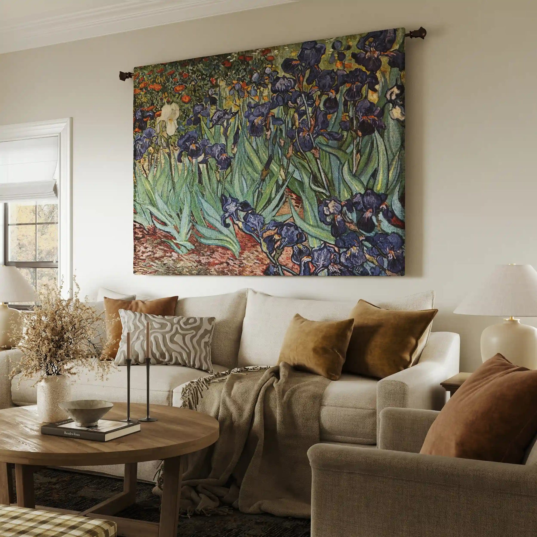 Vincent Van Gogh's famous painting Irises is depicted here in this beautiful brand new American woven wall tapestry. Irises was painted while Van Gogh was living in an asylum in France, in the last year before his death in 1890.