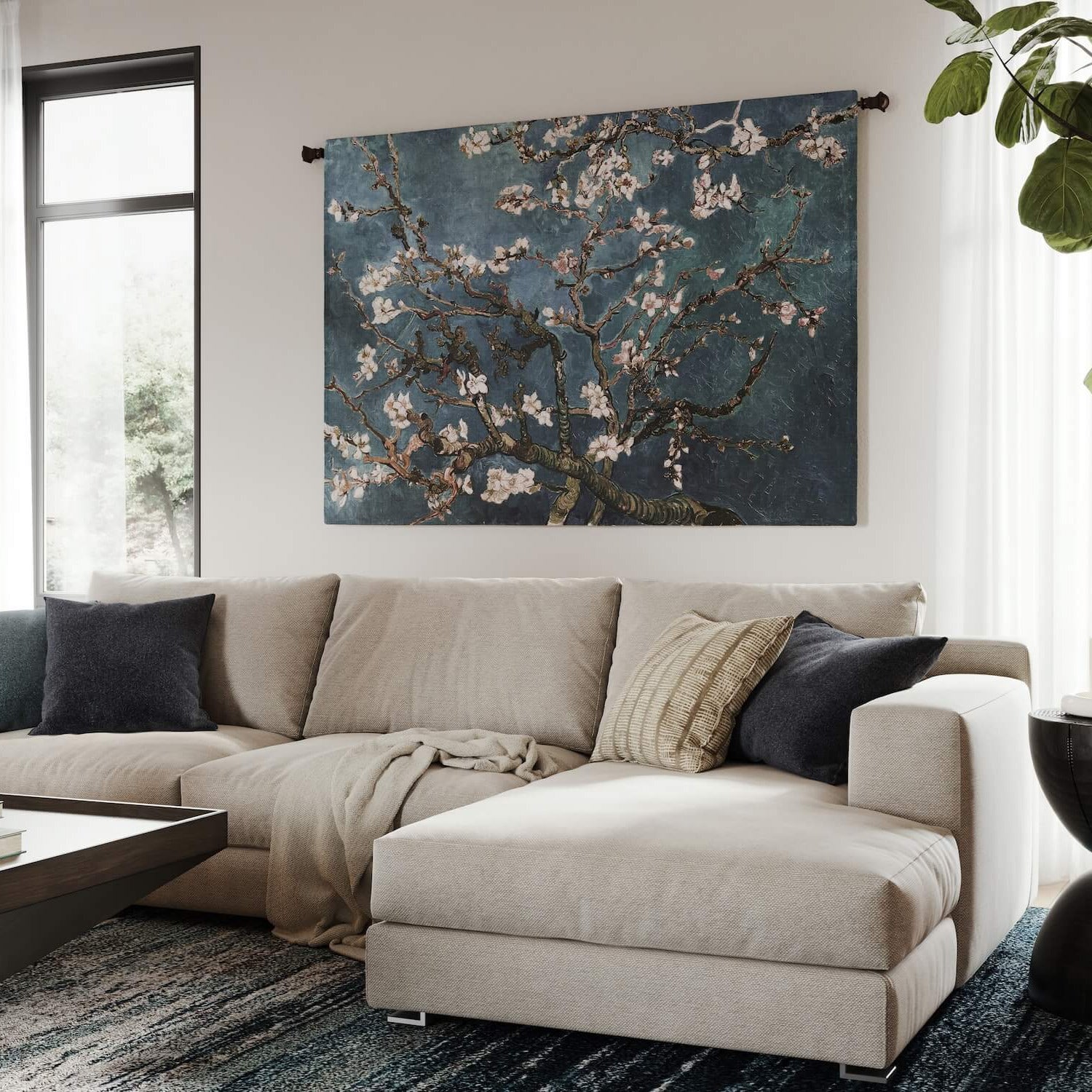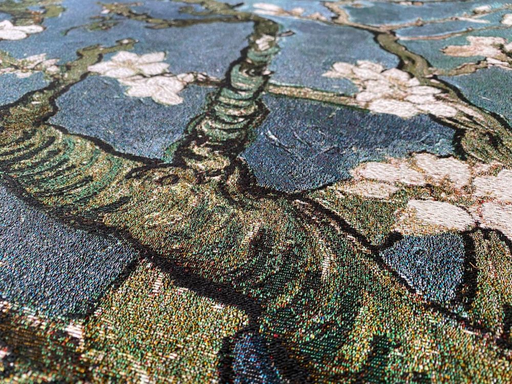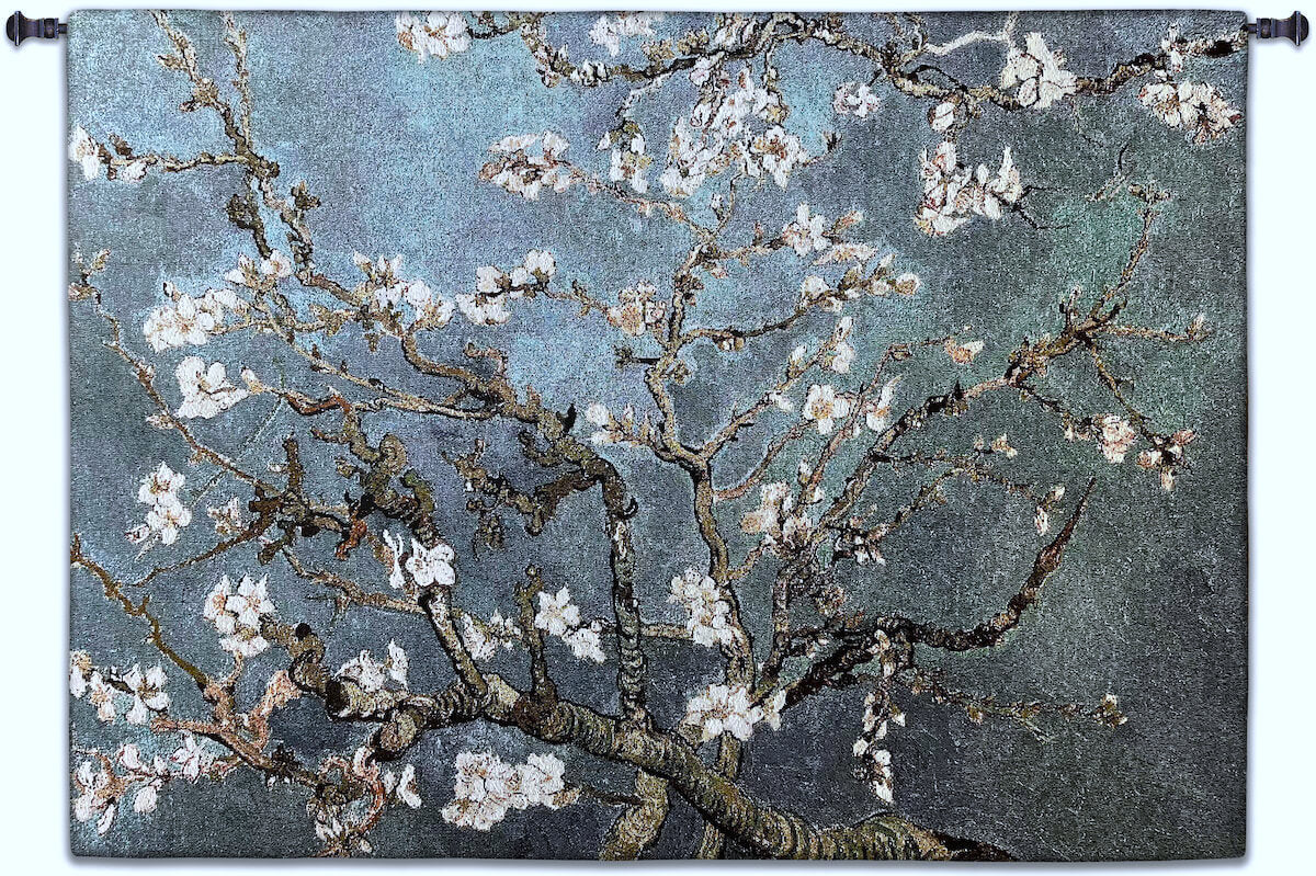 Vincent Van Gogh painted this beautiful still life of delicate almond blossoms in 1890 to commemorate the birth of his nephew. The branches of the almond tree were chosen as a symbol of new life, being a variety that blossoms in early spring in the south of France. The original painting has a clear blue sky. We have translated this and made it available in four different colors: blue-gray, red, teal and yellow! Each comes in a wide variety of sizes and is offered in a square, vertical or horizontal orientation. This selection is an exclusive offering by our company! Click here to see all 12 variations of the Almond Blossom Wall Tapestry.