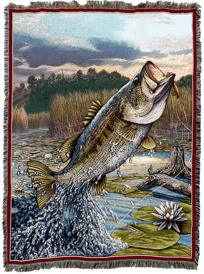First Strike Bass Blanket - Lake Wildlife Lodge Cabin Gift Tapestry Throw Woven from Cotton - Made in The USA (72x54)