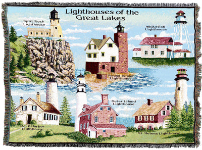 Lighthouses of The Great Lakes Blanket - Split Rock Round Island Whitefish Rock Harbor Outer Island St Helena - Coastal Ocean Gift Tapestry Throw Woven from Cotton - Made in The USA (72x54)