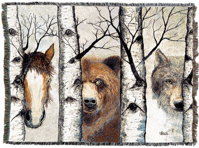 Trio Horse Bear Wolf Blanket by John Saunders - Wildlife Lodge Cabin Gift Tapestry Throw Woven from Cotton - Made in The USA (72x54)