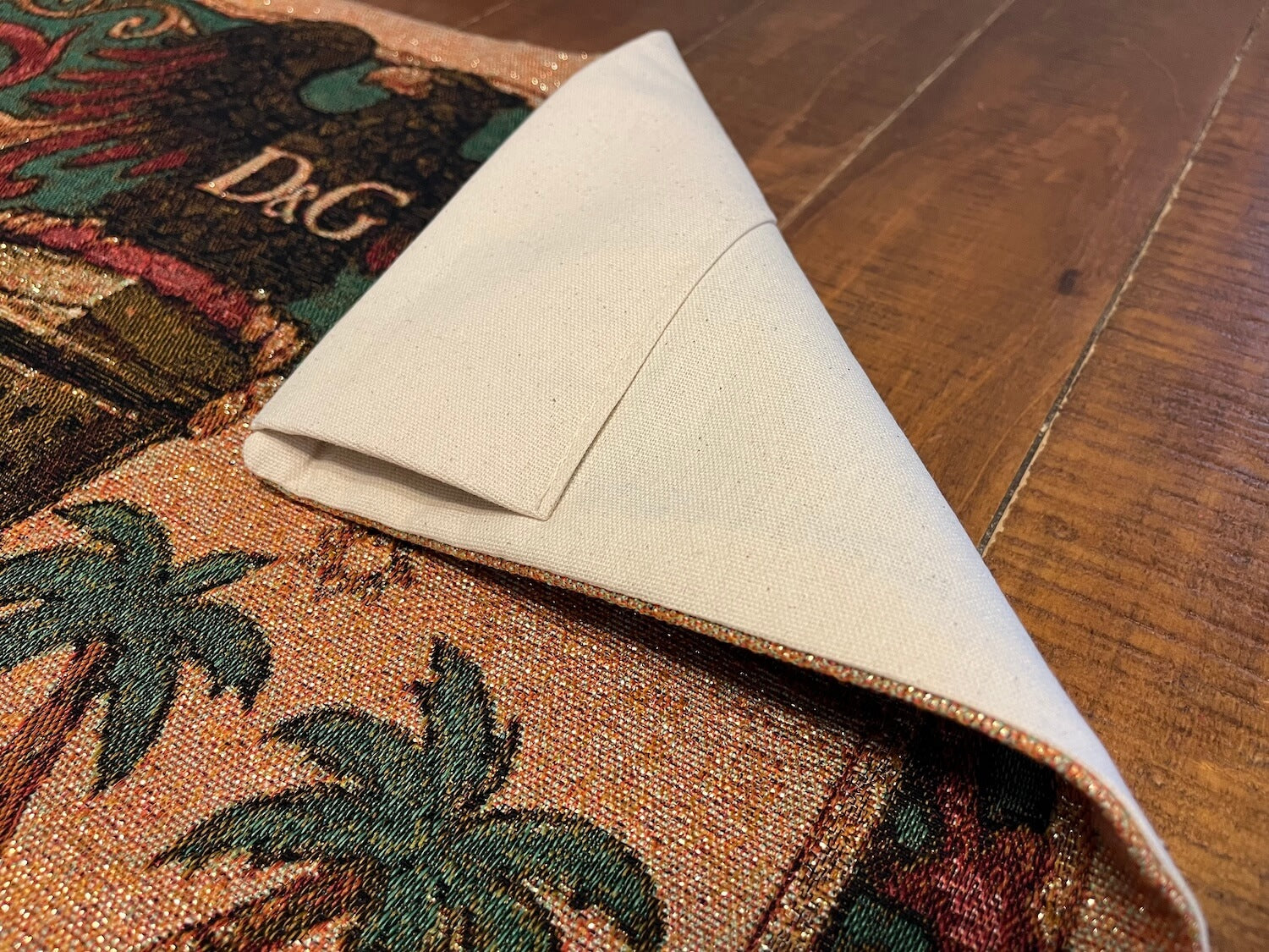 Most tapestries are finished on the backside with a natural colored fabric and a rod pocket along the top, as depicted here.