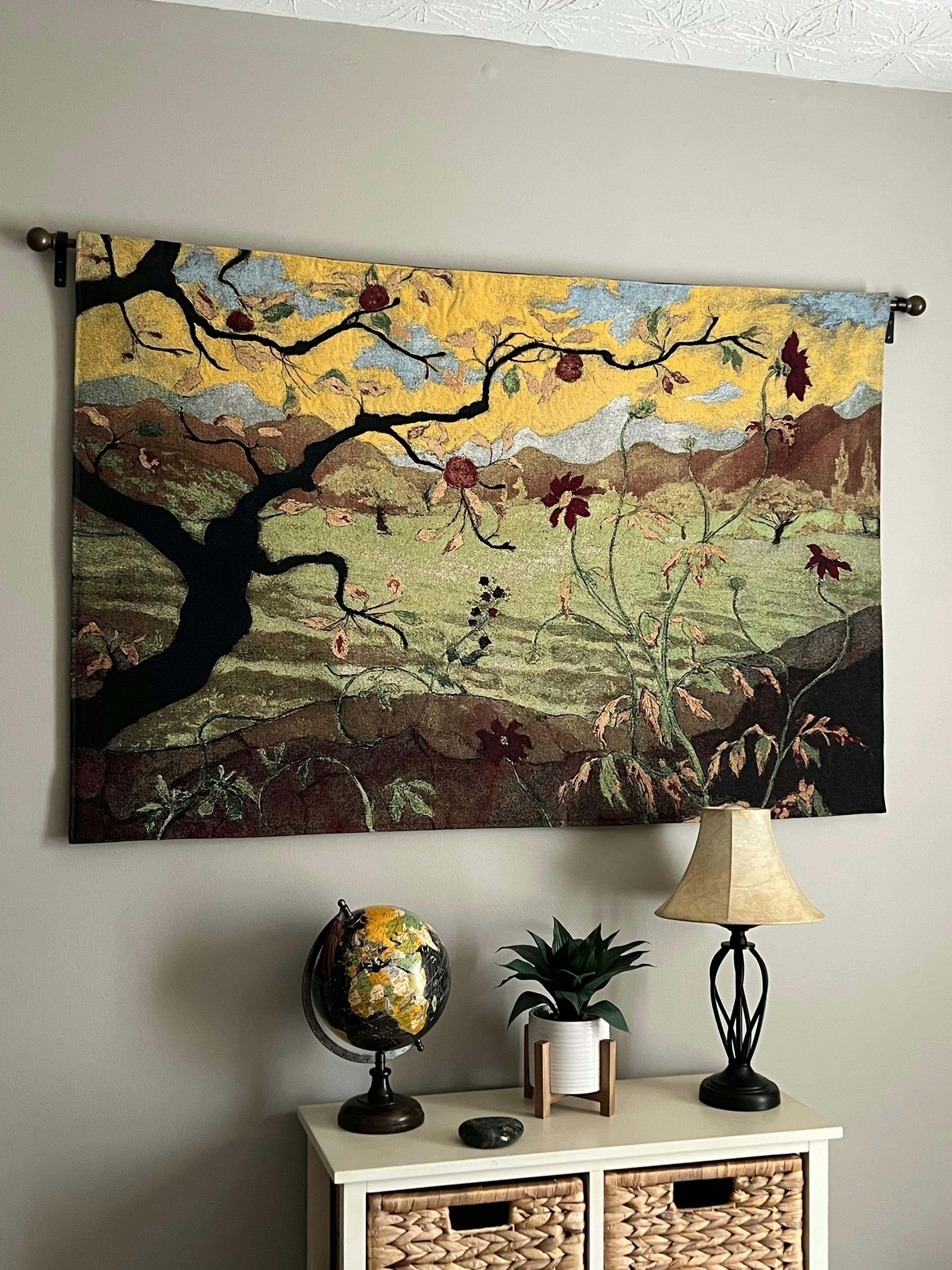This intricate piece translates Paul Ranson's famous 1902 work entitle Apple Tree with Red Fruit into fine textile form. Paul Ranson was a leader of the Nabis, a group of post-Impressionist, avant-garde Parisian artists who combined images of nature with symbols. Inspired by the subdued, stylized forms of traditional East Asian art, this wall tapestry is rich in color, texture, and history. It is the perfect way to add a soothing decorative influence to any space.