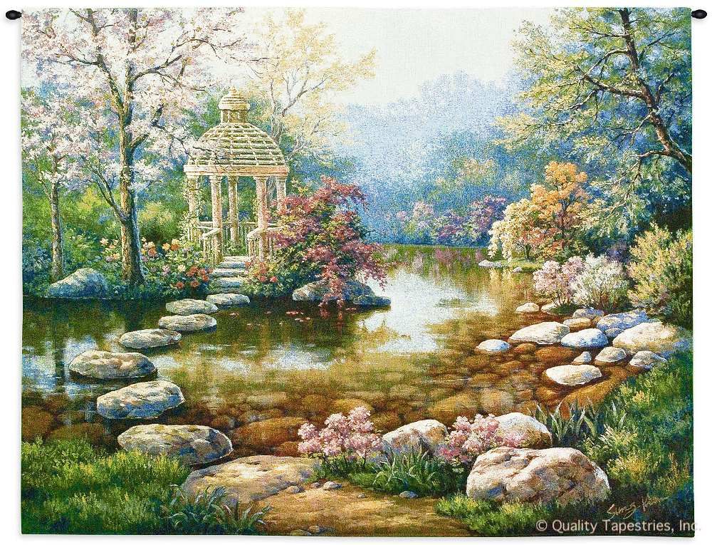 An enchanting tapestry with a tranquil gazebo set near a meandering stream in springtime splendor. A fantastic piece to light up any room!